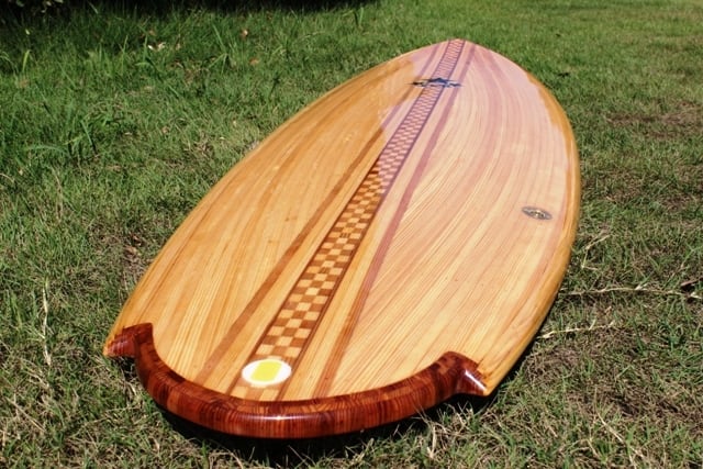 ・このウッドサーフボードはアーク・ストリップ工法(シーカヤックやカヌーなどに使われる製作方法です。)で製作しています。
